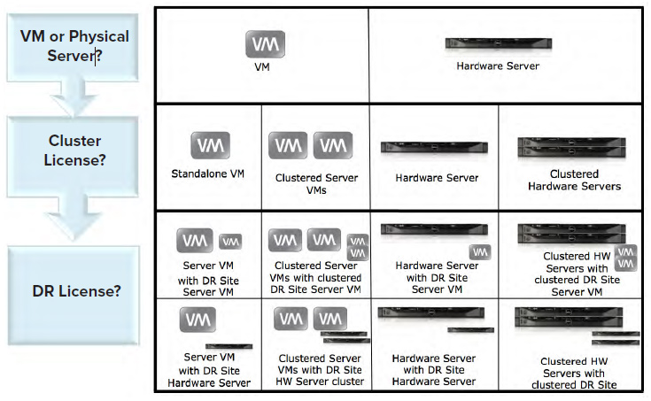 For each server license purchased, customers can choose to deploy one of two available virtual server editions or a physical server. Please refer to the Configuration and Deployment section of this brochure for guidelines in choosing the correct edition for your deployment. Deployments of clustered and disaster recovery servers can be mixed among virtual and physical servers as shown in the table below.